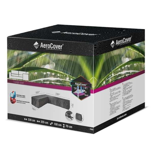The Aerocover Lounge Set Right Hand L Shape Cover is designed for breathability, reducing moisture and featuring a solution-dyed design for fading prevention. With rip-stop properties and sewn-in cords for a snug fit, this water-resistant cover provides effective protection for your right-hand L-shaped lounge set.
