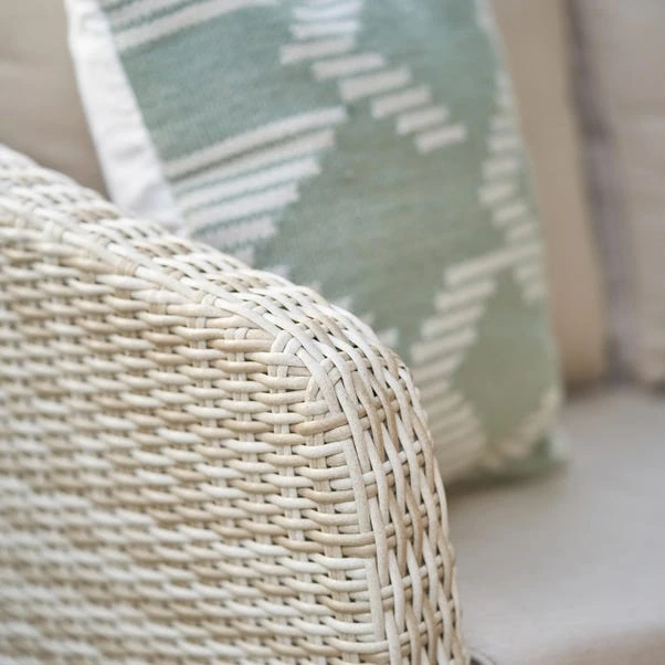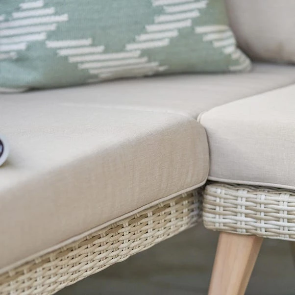Featuring a stunning combination of synthetic rattan and light teak effect acacia wood, this set includes left and right arm sofas, a coffee table, and two footstools, offering the perfect setup for outdoor relaxation. The pebble Olefin cushions provide comfort and durability, resistant to stains and fading. Crafted for long-lasting enjoyment, this set comes with a 3-Year Structural Guarantee. Use an Aerocover to maintain its pristine look when not in use.