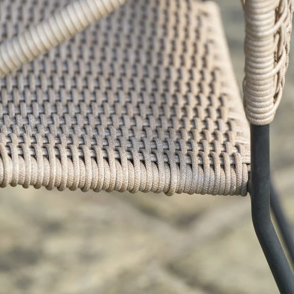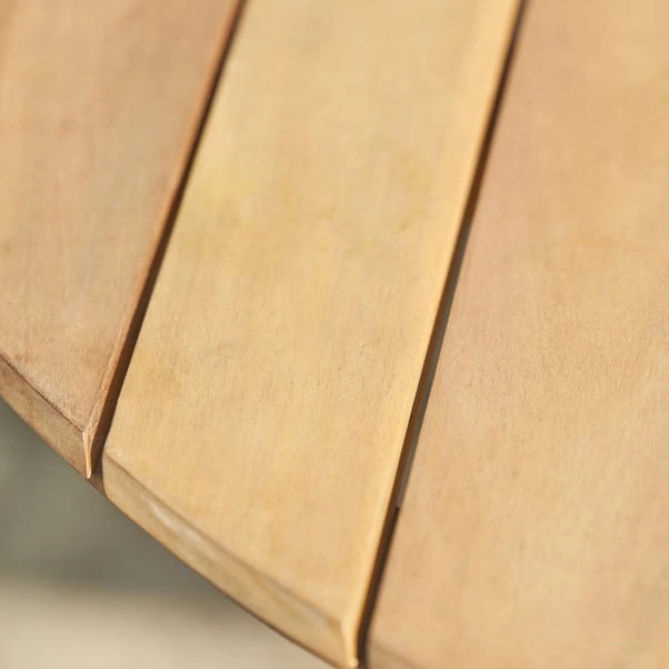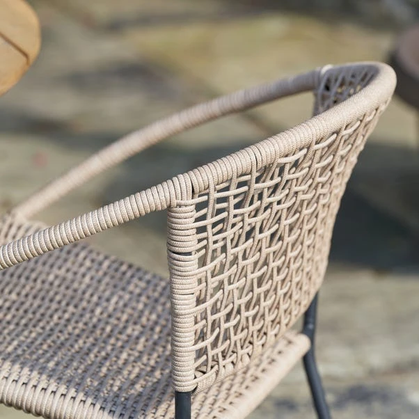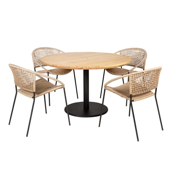 This set combines sustainable acacia wood with a black powder-coated aluminium frame and natural wheat-coloured rope weave. The circular table top made from light teak effect acacia wood is paired with modern, weather-resistant design elements. Low maintenance and durable, this set is ideal for stylish outdoor dining. With a 3-Year Structural Guarantee, you can enjoy it for years to come. For preservation, cover it with an Aerocover when not in use.