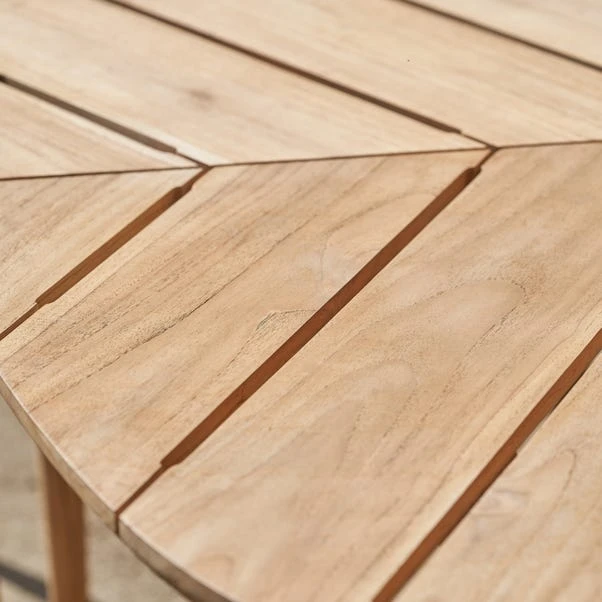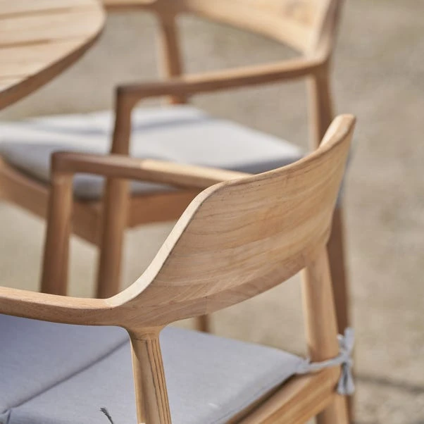 Introducing the Pacific Reuleaux 6-Seater Outdoor Dining Set, crafted from high-quality teak wood with a unique rounded triangle dining table featuring a chevron effect design. This set includes curved back chairs with light linen natural oatmeal Olefin cushions that are season-proof, resistant to staining, fading, and fire-retardant. Stylish and durable, this set comes with a 3-Year Structural Guarantee. Protect your set with an Aerocover when not in use to maintain its fresh, out-of-the-box look.