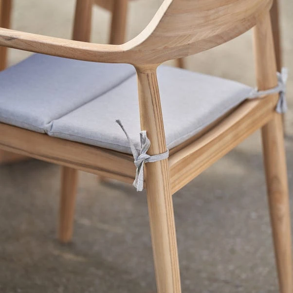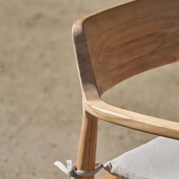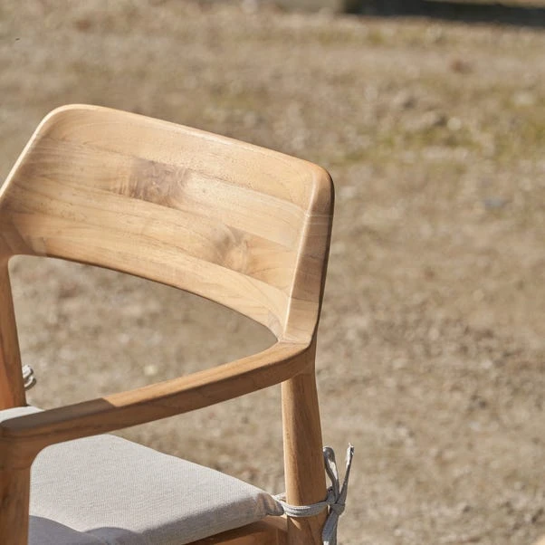 Featuring a rounded rectangular dining table and elegant curved back chairs, this set is crafted from natural teak wood, complemented by light linen natural oatmeal Olefin fabric cushions. The cushions are season-proof, resistant to staining, fading, and fire-retardant, ensuring longevity and comfort. The set is both stylish and durable, and it includes a 3-Year Structural Guarantee. For the best protection, use an Aerocover when not in use to maintain its fresh, out-of-the-box look.