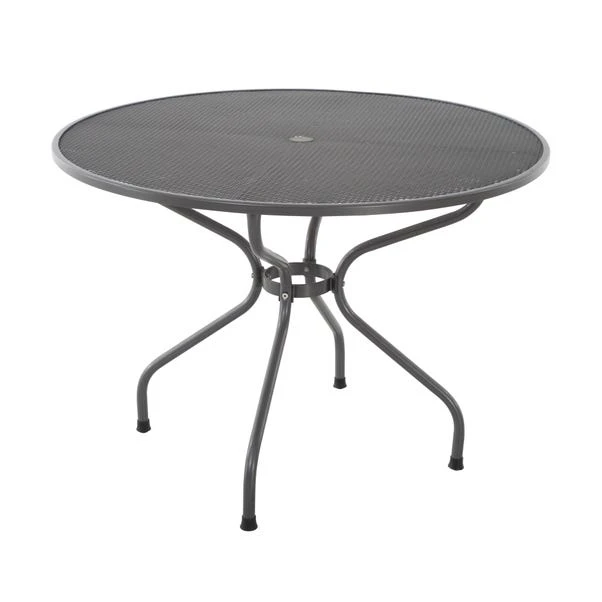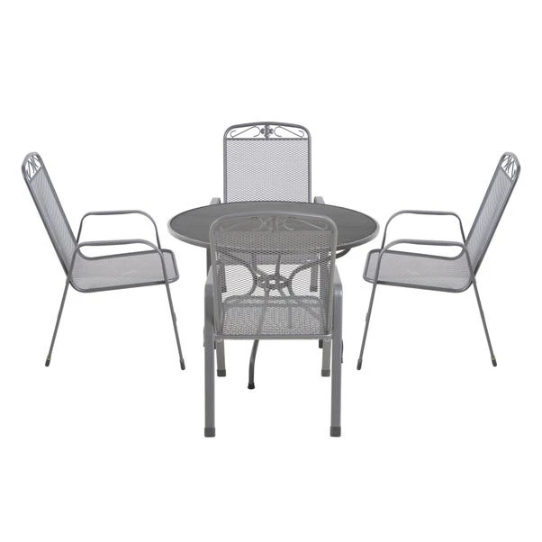 Add comfort and style to your outdoor space with the Savoy 4 Seater Round Dining Set. Featuring four stackable chairs with floral detailing and a round dining table, this set is perfect for al fresco dining. Made from premium Dark Grey steel with an Elotherm coating, this set is both sturdy and weather-resistant. The table includes a parasol hole for added functionality.