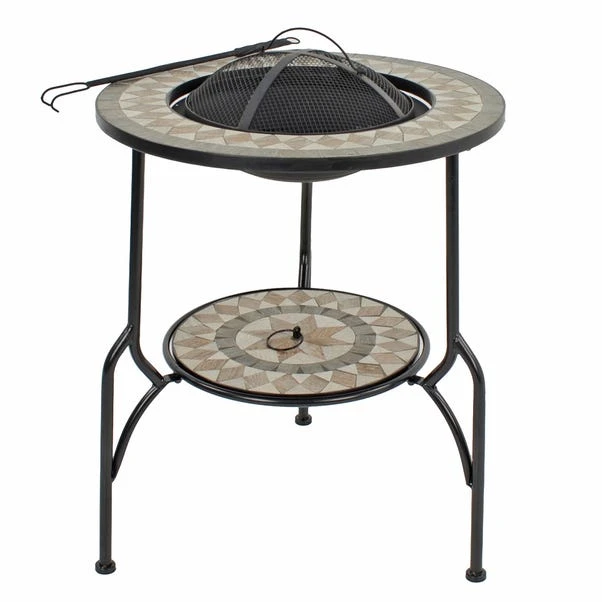 The Summer Terrace Brava Tall Fire Pit is designed with a rounded fire pit with a mesh cover and tools, as well as a lower storage table; finished with a durable metal frame and stylish mosaic ceramic tile.