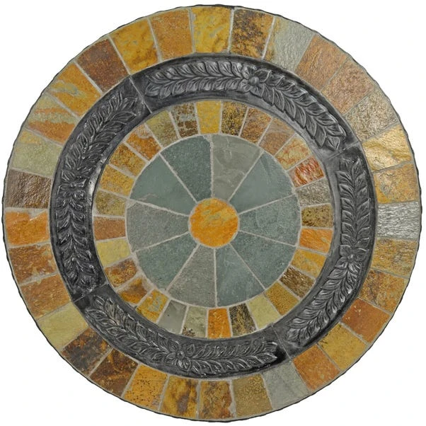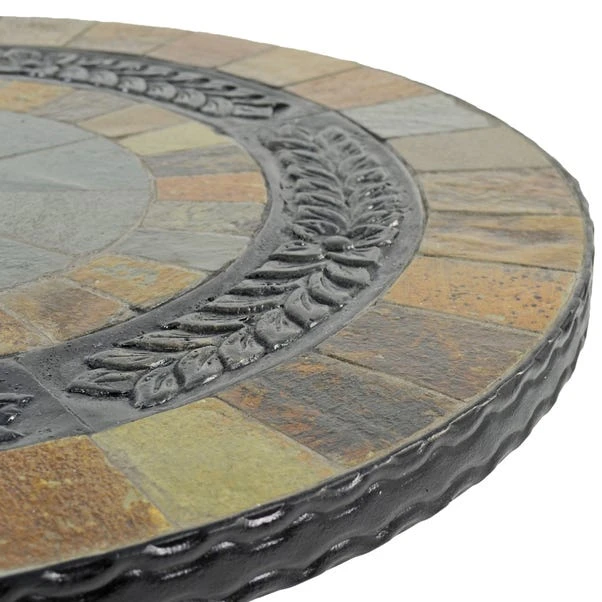 The Villena Bistro Set includes a beautiful 60cm round bistro table that will add a rustic charm to any garden setting. It is made with hand-cut riven stone and slate mosaic and the inclusion of a moulded embossed leaf design adds to the look. The Malaga chairs include matching mosaic elements.